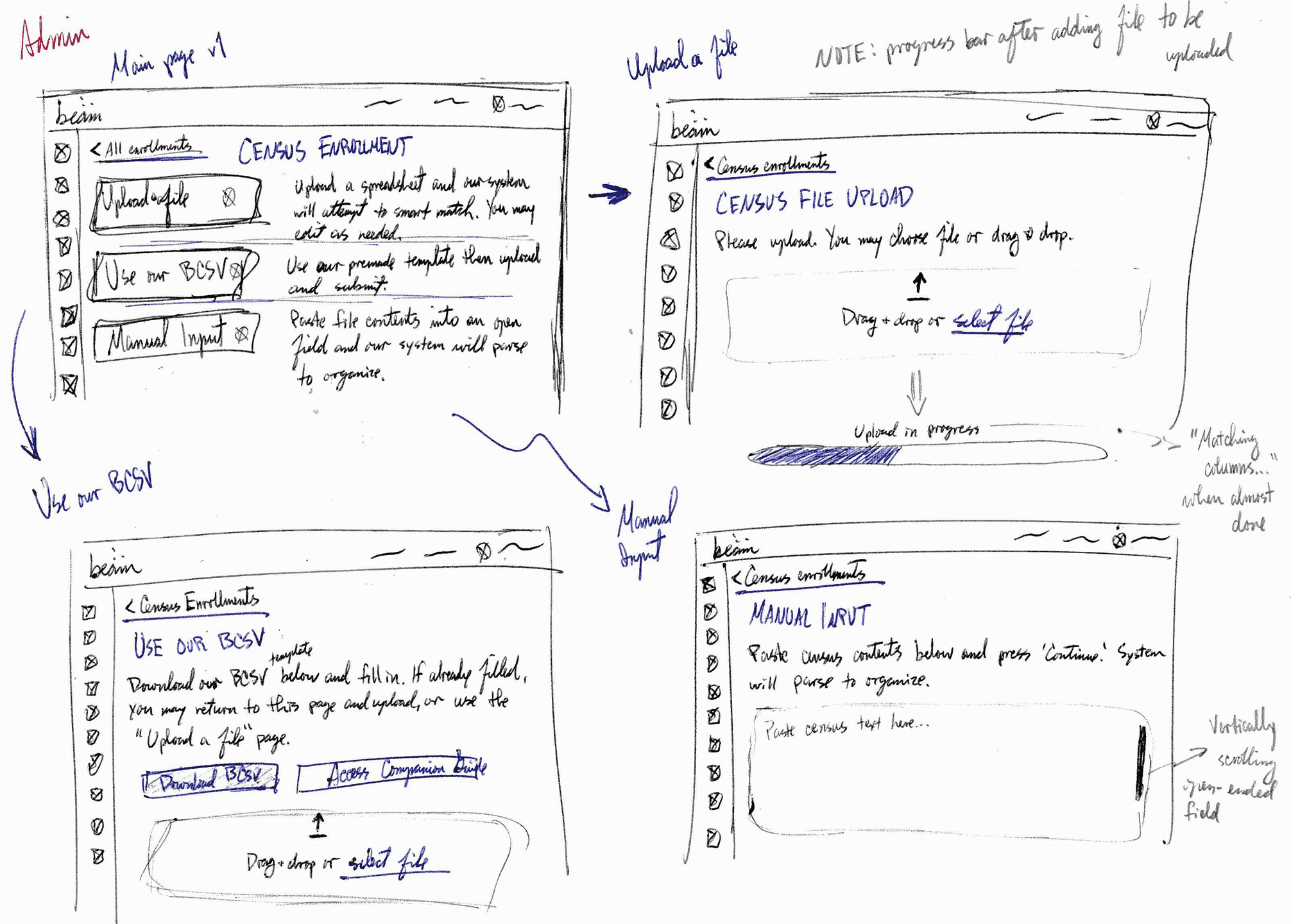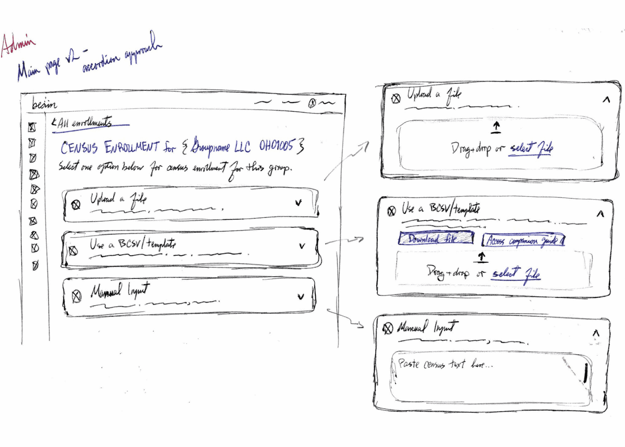 There were already some good directions I could run from: some competitors, Beam's current Admin census enrollment experience, and Beam's quoting tool's census enrollment UX. Using these as a foundation, I made sure to align with the Product team on my proposed direction, then relied on our Research team to weave usability tests into their ongoing interviews with brokers and HR admins while I fleshed out the prototype.